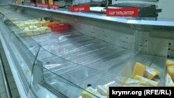 Общая черта всех супермаркетов Крыма – пустые молочные ряды. Украинской молочной продукции на крымских прилавках нет уже около месяца. Поставки российской – нестабильны. Крымская власть вынуждена признать – без украинского молока обеспечить Крым не сможет.