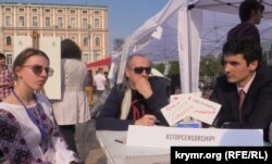В палатке, выставленной общественной инициативой Крым SOS, предлагали изделия талантливых переселенцев, рассказывали о фильме «Мустафа», демонстрировали фотовыставку и провели фотосет.