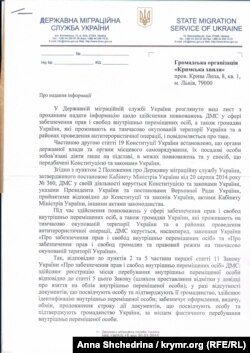Общественники указали на эти слова главы ГМСУ в своем письме, однако в миграционной службе этот момент проигнорировали. «Каково же было наше удивление, когда замначальника миграционной службы, то есть непосредственный подчиненный чистосердечно признавшегося чиновника, во-первых, полностью опровергает слова своего начальника и указывает на то, что ГМСУ не контактирует с незаконными органами, созданными на временно оккупированных территориях. Во-вторых, указывает на то, что в случае выявления такого контакта их территориальных органов ими «будут предприняты соответствующие меры», ‒ возмущается юрист.