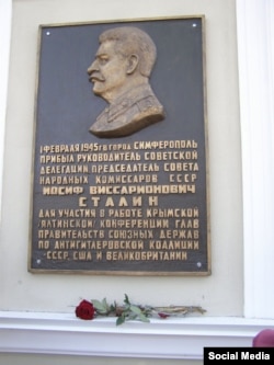 Отличились в День памяти и представители Украинского культурного центра (УКЦ) Крыму. Они возложили на доску с портретом Сталина композицию из цветов, увитых колючей проволокой. По словам члена УКЦ Алены Поповой, таким образом активисты почтили память жертв депортации крымских татар.