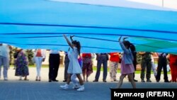 Крымскотатарский флаг размером 10,5 на 7,5 метров был развернут на площади Свободы в Херсоне во время прошедших сегодня торжеств в честь Для крымскотатарского флага.
