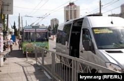 На противоположной стороне трассы на остановке в сторону Симферополя все же собралась небольшая толпа жаждущих уехать. Но первый же подошедший троллейбус забрал всех, так что маршрутке приходится ждать пассажиров.