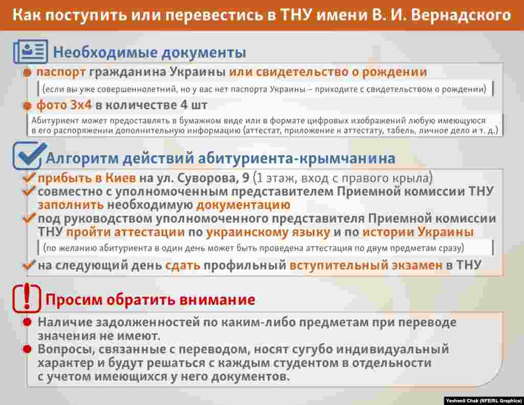 Таврический национальный университет имени В. И. Вернадского сообщает о начале вступительной и переводной кампаний. Приемная комиссия ТНУ начинает работу с 1 июля и будет расположена по адресу: г. Киев, ул. Суворова, 9. Приемные дни: понедельник-пятница – с 9.00 до 17.00; суббота – с 9.00 до 13.00; воскресенье – выходной.