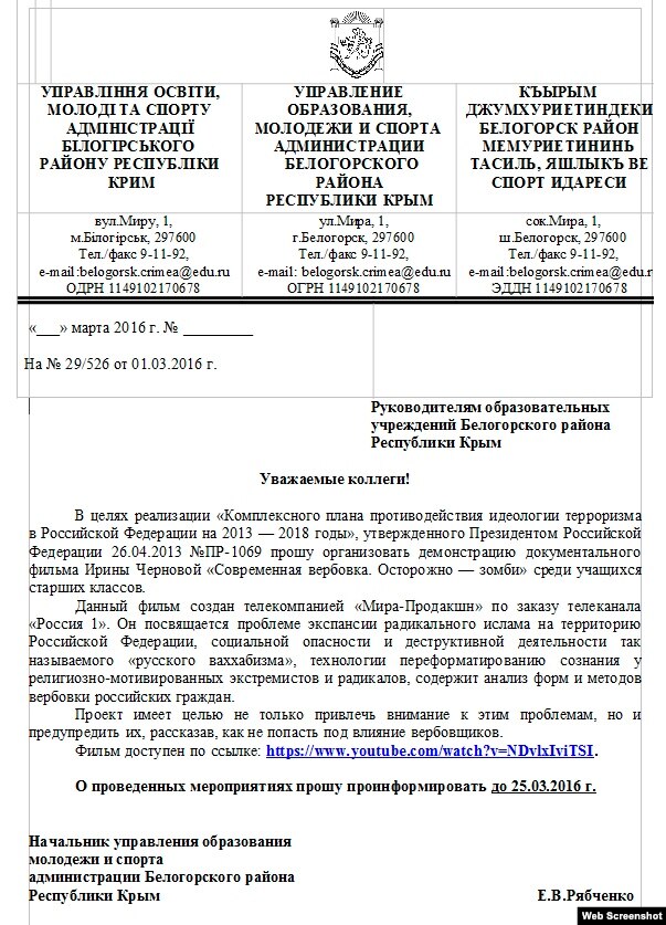 Демонстрация фильма пройдет в рамках реализации «Комплексного плана противодействия идеологии терроризма в Российской Федерации на 2013-2018 годы», утвержденного президентом России 26.04.2013 №ПР-1069 сообщается в письмах, разосланных чиновниками российского министерства образования Крыма по школам полуострова.