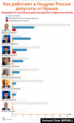 С момента появления в Госдуме России депутатов от Крыма прошло пять месяцев. В Украине и мире их по-прежнему считают нелегитимными, а российских властей неоднократно упрекали за организацию думских выборов на аннексированном полуострове. Крым.Реалии проанализировали, насколько успешной и продуктивной оказалась деятельность крымских депутатов в нижней палате российского парламента.