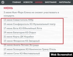 На прошлой неделе в Крыму гастролировала российская певица Елена Ваенга. На ее официальном сайте указано, что певица в течение десяти дней выступила в шести крымских городах: Севастополе, Симферополе, Ялте, Евпатории, Керчи и Феодосии.