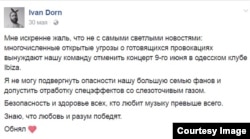 Угрозы от соотечественников поступали и украинскому музыканту Ивану Дорну, в связи с чем в мае 2017 года он отменил свой концерт в Одессе. Претензии к политическим взглядам артиста высказывают обе стороны. Украинцы обвиняли его в дружбе с российскими певцами, которые поддерживали "политику агрессора". А россияне – в том, что он пожертвовал деньги на поддержку АТО, о чем написал в социальных сетях волонтер и шоумен Сергей Притула. В интервью российскому журналисту Юрию Дудю Иван объяснил, что "деньги давались на пострадавших в Мариуполе, когда произошел обстрел. Но один из волонтеров, который и писал этот пост, решил распорядиться этими деньгами по-другому". Сам Иван Дорн на своих концертах всячески пытается помирить народы, утверждая со сцены "между нами нет ничего, кроме дружбы".