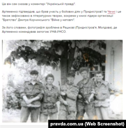 Мужчина подтвердил, что участвовал в боевых действиях в Приднестровье, и Чечне и это также зафиксировано в литературных произведениях, в частности в книге лидера организации «Братство» Дмитрия Корчинского «Война в толпе». По его словам, фотография сделана в Рашкове (Приднестровье, Молдова), где Артеменко командовал «гарнизоном УНА-УНСО».