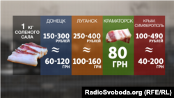 В подконтрольном Украине прифронтовом Краматорске цены на готовое соленое сало колеблются в пределах 80 гривен за килограмм. «Гривен 80-90, если нормальное сало, должно стоить», ‒ объясняет местный житель. В то же время цены на сырую свинину зависят от типа мяса.