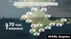 Сейчас в аннексированном Крыму насчитывается минимум 18 воинских частей армии России. По данным украинской разведки, на полуострове служат 70 тысяч военных и спецназовцев. Это в три раза больше, чем украинских военных до аннексии Крыма.