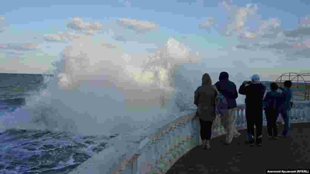 Брызги на вечерней набережной: штормовое предупреждение в Алуште (фотогалерея)