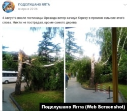 Непогода добралась и до Южного берега Крыма. В Ялте ураганный ветер, бушевавший 4 августа, снес деревья в разных частях города. Фото публикуют очевидцы в группе «Подслушано Ялта» во «ВКонтакте».