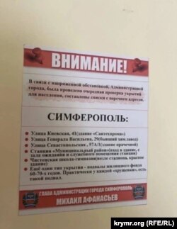 19 июля в подъездах симферопольских многоэтажек появились листовки, сообщающие о проверке укрытий. Фотографию такой листовки в редакцию Крым.Реалии прислал читатель.