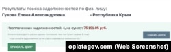 В публичном российском сервисе государственных платежей Федеральной службы судебных приставов РФ указано, что всего у Елены Гуковой имеется четыре неоплаченных задолженностей на общую сумму более 75 тысяч рублей. Чтобы покрыть эту сумму из ее пенсии, необходимо больше года.