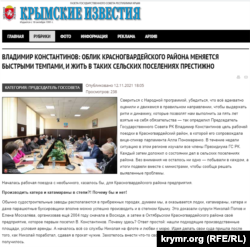 12 ноября в 18:05 на сайте газеты «Крымские известия» появился репортаж под заголовком «Владимир Константинов: облик Красногвардейского района меняется быстрыми темпами, и жить в таких сельских поселениях престижно». В тексте – 95 процентов рассказов об успехах власти: о производстве катеров и катамаранов в степи, о строительстве в селе Полтавка общественно-культурного центра, о строительстве психоневрологического интерната в селе Некрасово, который будет «на уровне четырехзвездочного отеля», о «потрясающем» обустройстве общественных территорий вокруг домов в селе Октябрьском, строительстве некоего физкультурно-оздоровительного комплекса открытого типа. Все эти будничные, и, главное, одиночные и сильно преувеличенные дела описаны как огромные шаги власти в благоустройстве Крыма.