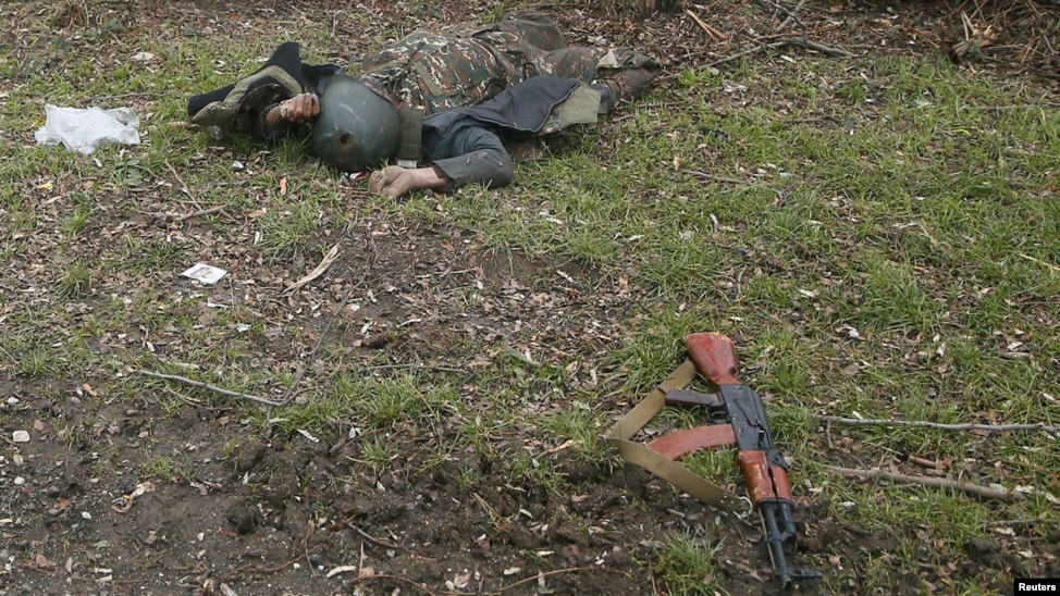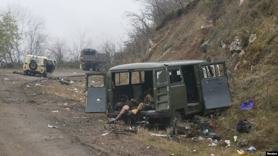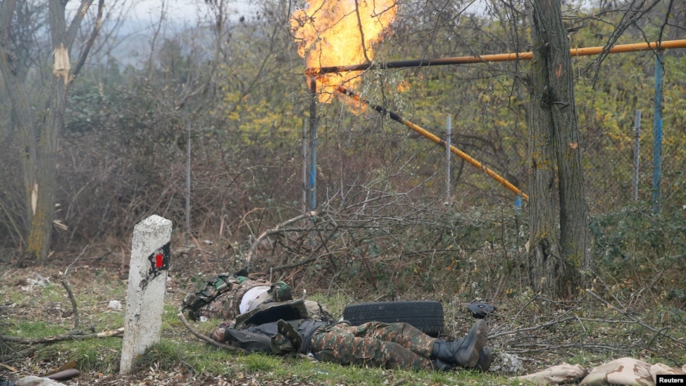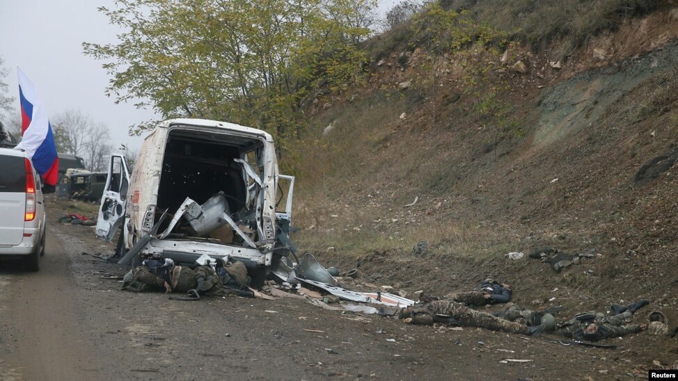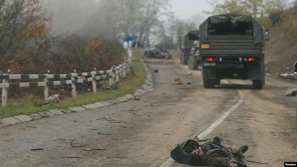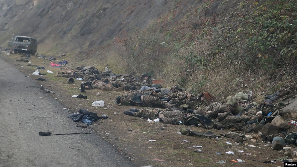 Тела убитых людей на обочине дороги возле города Шуша, захваченного азербайджанскими войсками 8 ноября. RFE/RL не удалось установить национальность погибших бойцов на фотографиях, сделанных с колонны