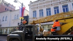 Коммунальные службы Симферополя готовят город к празднованию пятилетия российской аннексии Крыма. Как сообщает корреспондент Крым.Реалии, проспект Кирова украшают разноцветными флагами.