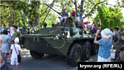 В то же время на Приморском бульваре возле пунктов пропуска скопилось несколько сотен туристов из России, у которых не было пропусков и пригласительных билетов, военнослужащие не пускали их на смотровые трибуны.