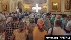 В соборе в Херсонесе провели совместную литургию, при этом присутствующие были без масок и не соблюдали социальную дистанцию. На время службы в верхнем зале собора выставили раку с мощами князя Владимира.