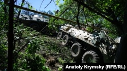 В Крыму, неподалеку от Симферополя, 14 мая российский военный бронетранспортер, который буксировал на жесткой сцепке неисправный бронетранспортер, стесал несколько десятков метров отбойника объездной ялтинской трассы.