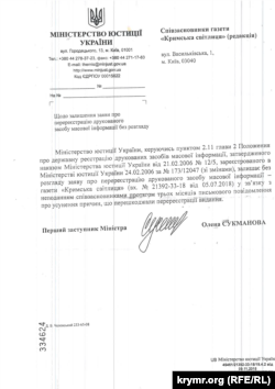Директор издательства показывает Крым.Реалии упомянутый указ министерства и подчеркивает: он не может перерегистрировать издания, пока нет решения основателя об их реформировании.