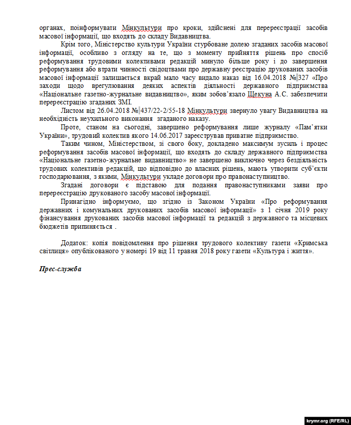 Ведомство уверяет, что обеспокоено судьбой изданий, а также что своим указом обязало Андрея Щекуна обеспечить перерегистрацию газет и журналов «Национального газетно-журнального издательства», в том числе «Кримської світлиці».
