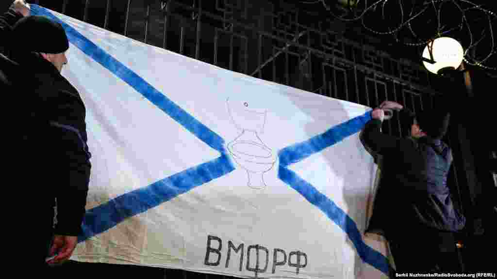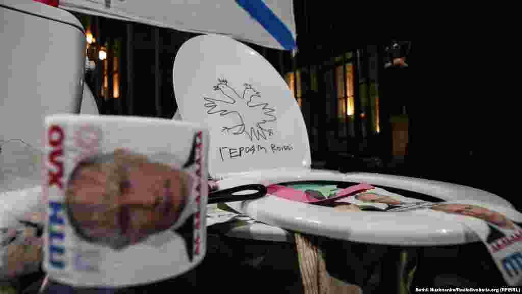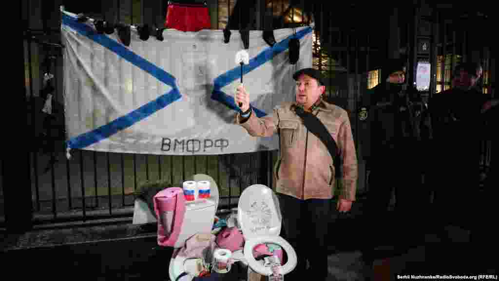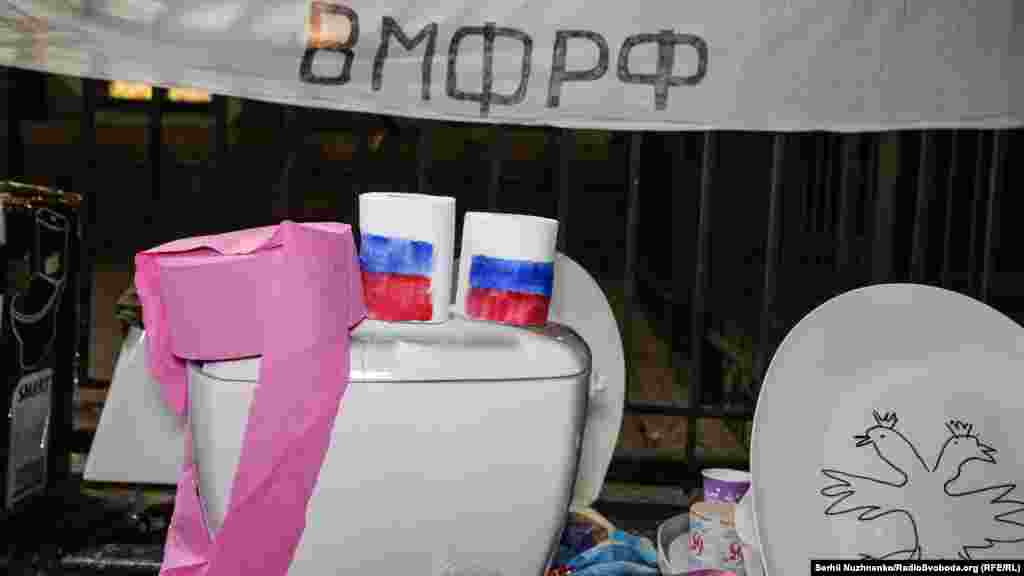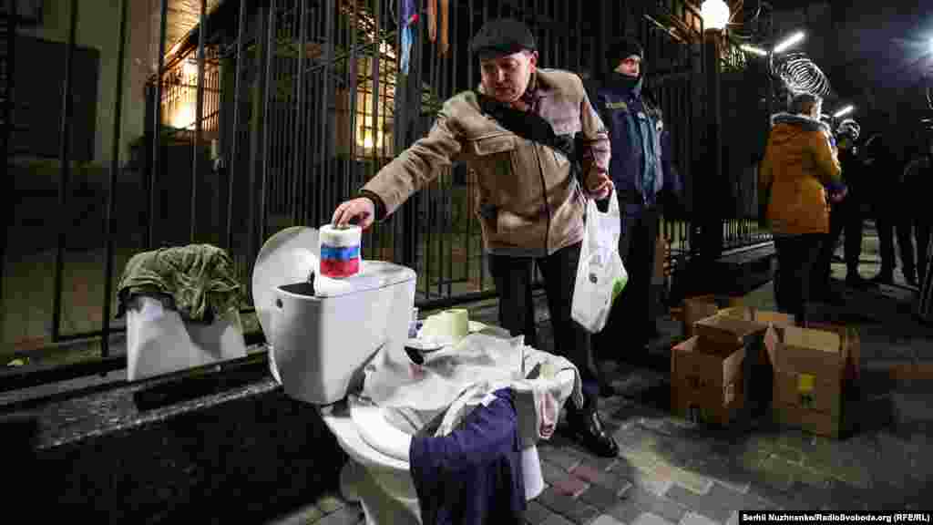 В Киеве под зданием посольства России прошла акция «Первый украинский гумконвой для России». Десятки киевлян принесли под российское ведомство унитазы, туалетную бумагу, нижнее белье, чтобы «материально помочь россиянам». Также активисты изобразили «флаг» Военно-морских сил России и медаль «За взятие унитаза».