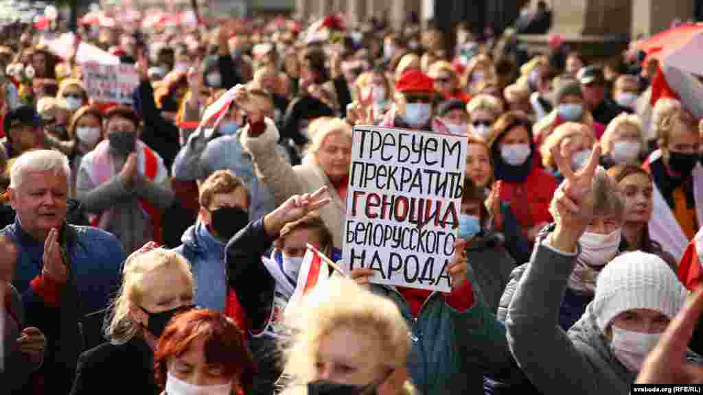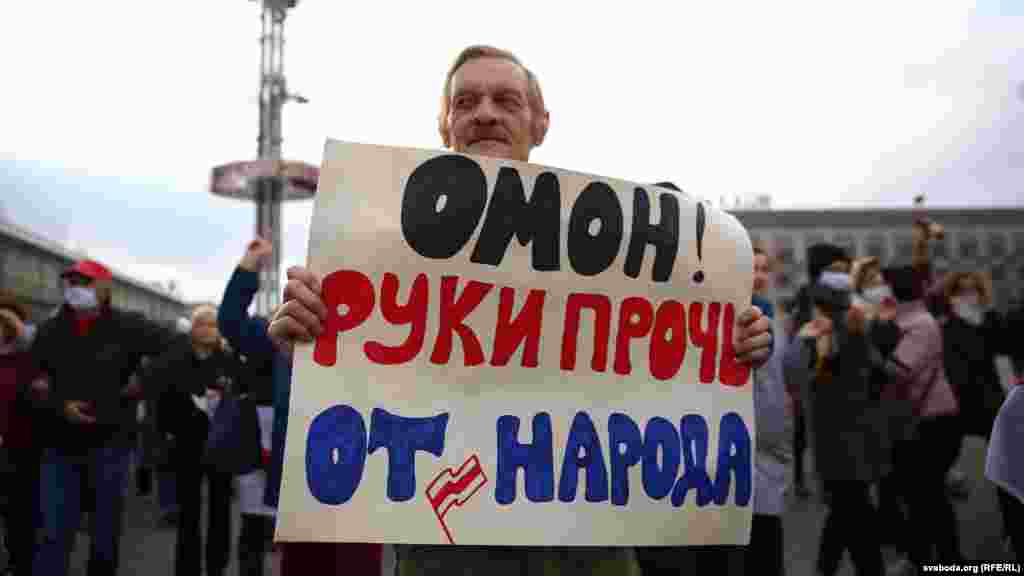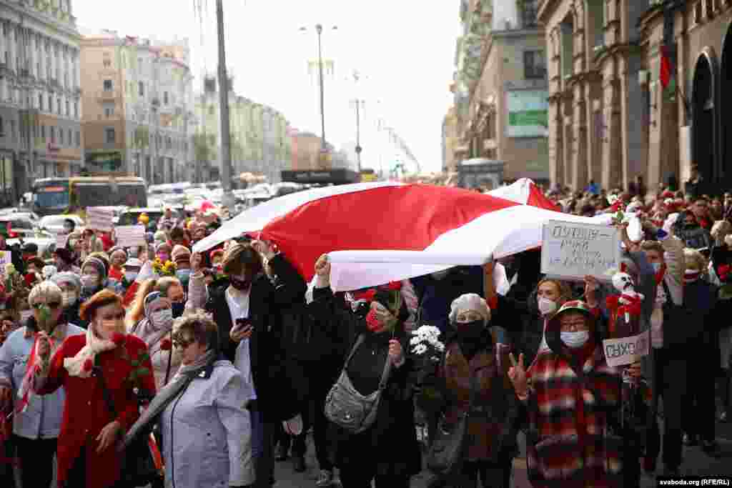 Уже традиционно по понедельникам на минской площади Независимости у костела Святых Сымона и Алены пенсионеры собрались на марш. Колонной они прошли по проспекту Независимости. К шествию присоединялись прохожие всех возрастов. Среди них много студентов, которые с утра вышли на акции протеста и поддержали всеобщую забастовку.